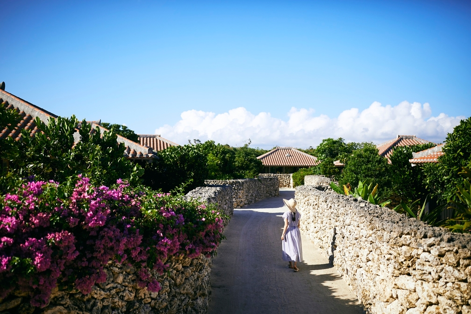 竹富島の東に位置する琉球赤瓦の集落「星のや竹富島」。約2万坪の敷地には、島内の家々と同じように伝統を尊重して建てた戸建の客室、白砂の路地、プール、見晴台などがあり、小さな集落が構成されています。