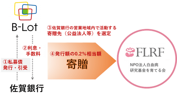 株式会社ビーロット(本社:東京都港区、代表取締役社長:宮内 誠、東証一部:3452)は、株式会社佐賀銀行(本店:佐賀県佐賀市、取締役頭取:坂井 秀明「以下、佐賀銀行」) を引受先とする「さぎんSDGs私募債 ”地域の芽 未来の芽・育む債” 」を発行し、伴いまして認定特定公益信託 日本白血病研究基金(所在地:東京都中野区、運営委員長:水谷 修紀、以下「日本白血病研究基金」)に寄付を行いましたので、お知らせいたします。