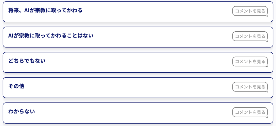 当社では作家・ジャーナリスト、正覚寺住職の鵜飼秀徳氏のもと、「ChatGPTの登場は、宗教を衰退させるか?」というイシュー(課題)を作成し投票を開始しました。https://surfvote.com/issues/s5i1nz6fwl1f