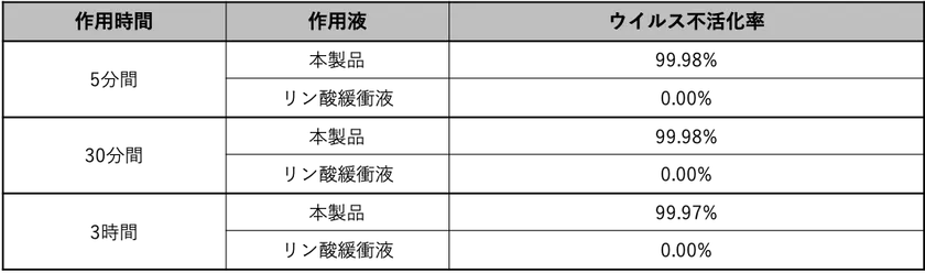 北里大学医療衛生学部臨床微生物学研究室の教授・医学博士である田口 文章氏によって、ウイルス不活化定量試験を実施。試験品の液にウイルス-A(薬機法の遵守から具体的なウイルス・細菌名の記載は控えさせていただきます)1/10の量を加えて、作用時間は5分間、30分間、3時間の経過測定し、試験品のウイルス不活率を求めました。