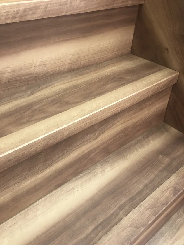 ・本工法に用いるシートは、フローリング柄が印刷されたオレフィンシート(約0.2mm厚、凸版印刷株式会社の協力により開発)で、耐久性・耐水性に優れ、表面のデザイン性も高いため、既存のフローリング床の他、上り框や床見切り等の細かな箇所への施工に加え、階段のリフォームも美しい仕上がりになります。