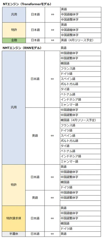 ある分野の対訳集を使ってエンジンの深層学習を行うことで、その分野の訳文の精度を上げることができます。その技術を使用して、収集した対訳で学習(アダプテーション)させた分野特化型エンジンを作成し、リリースしています。「汎用エンジン」の他に分野に特化した「特許エンジン」、「特許請求項エンジン」、「半導体エンジン」をリリースしていますが、2020年4月には金融分野に特化したエンジン(Transformerモデル)をリリース予定です。今後もさまざまな分野のエンジンをリリースしていきます。