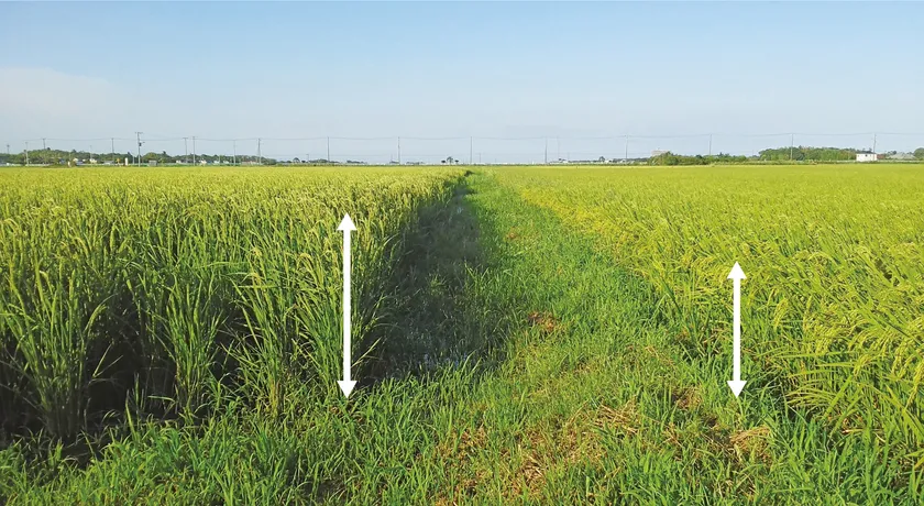 水田へのフジミン(R)散布結果(左:散布区 右:無散布区)