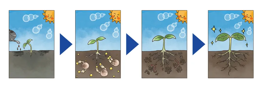 ※キレート効果とは、土壌中の吸収されにくい養分をフルボ酸がカニのハサミのようにはさみ込んで、吸収されやすい形に変えたり、反対に有害物質を無害化したりする効果のことです。フルボ酸は「ミネラルの運び屋さん」とも呼ばれます。