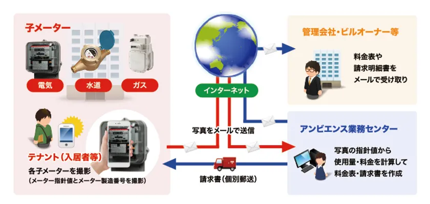 当社は15年にわたりオフィスビルを中心とした数百棟以上の建物で、大手ビル管理会社様の検針・請求業務を代行してきました。そこで長年のノウハウを活かして、電気・水道メーターをスマホで撮影→メールで送信→アンビエンスで受信。使用量・使用料金を計算し、料金一覧表や請求書の発行までを行います。