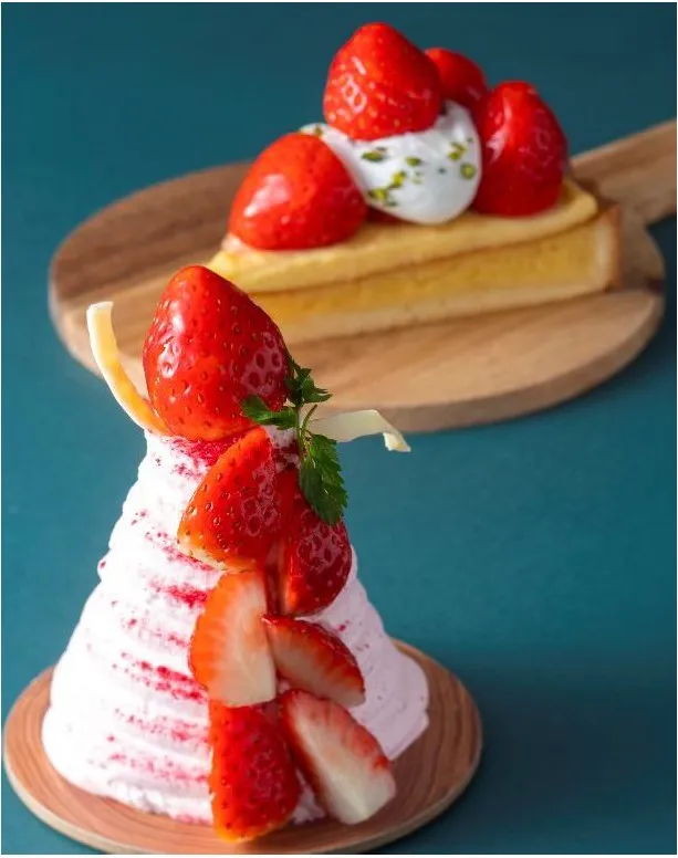 ピンクのホイップクリームが目を引く「苺のモンブラン」は、中に白あんムースや抹茶ダマンドを使用し、和の要素も取り入れました。しっとりとしたタルト生地に苺をトッピングした、毎年人気の「苺のタルト」もお楽しみいただけます。手土産やご自身へのちょっとしたご褒美にもおすすめです。