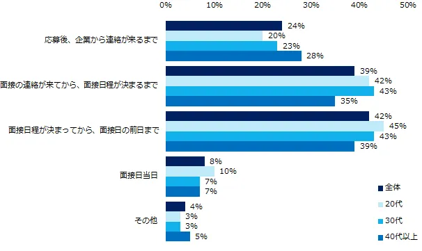 「転職活動の面接を辞退したことがありますか?」と伺ったところ、28%が「ある」と回答しました。面接辞退の経験がある方に「辞退を決めたタイミングはいつでしたか?」と伺うと、81%が「面接の連絡が来てから、面接日前日まで」(面接の連絡が来てから、面接日程が決まるまで:39%、面接日程が決まってから、面接日の前日まで:42%)でした。大半が前日までに企業へ連絡しているものの、中には「面接日当日」(8%)に辞退という方もいることが分かりました。年代別で見ると、年代が上がると、早めに辞退を決めていることが分かります。