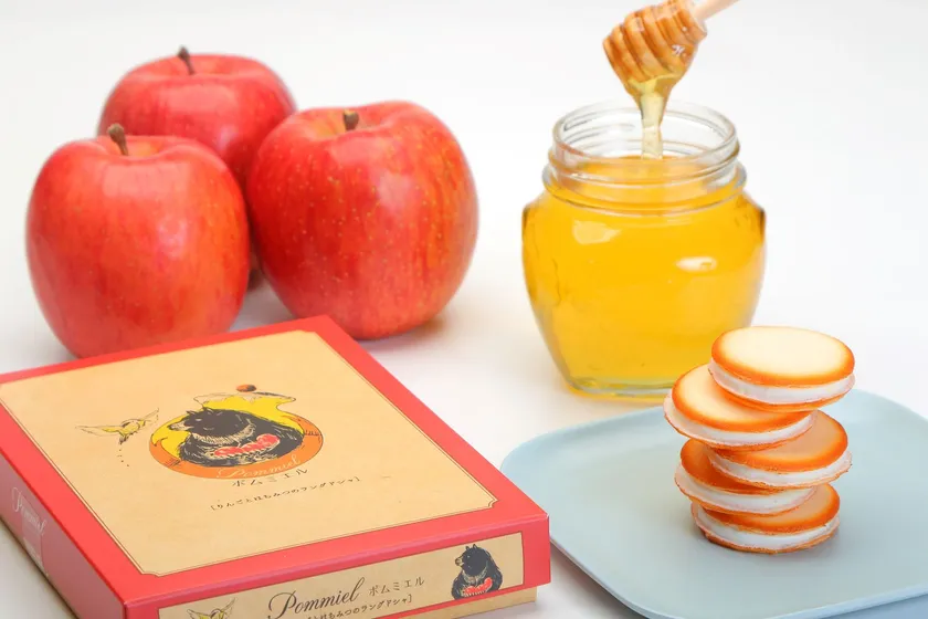 りんご農家を営むツキノワグマの「ポム」と養蜂家のハチドリの「ミエル」の友情物語です。それぞれが作っているりんごとはちみつを使ってお菓子にしようと試行錯誤の中、ようやく納得のいく美味しいスイーツを作ることができました。りんごとはちみつが香る、5層のラングドシャです。いよいよ二人はお店を出します。フランス語でポムはりんご、ミエルははちみつを意味します。そんな二人がつけたお店の名前は「ポムミエル」といいます。友情の傑作スイーツを是非味わって下さい。