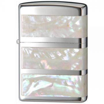 まさに新しい門出をお祝いするのにぴったりの白い貝を継ぎ目なくボディ3面に貼りつけ加工したZippoライター。見る角度によりさまざまな表情を見せる光沢のある白い貝が、高級感を引き立てます。この白い貝を使用したデザインは全部で2種。