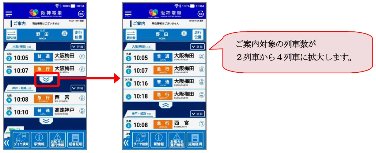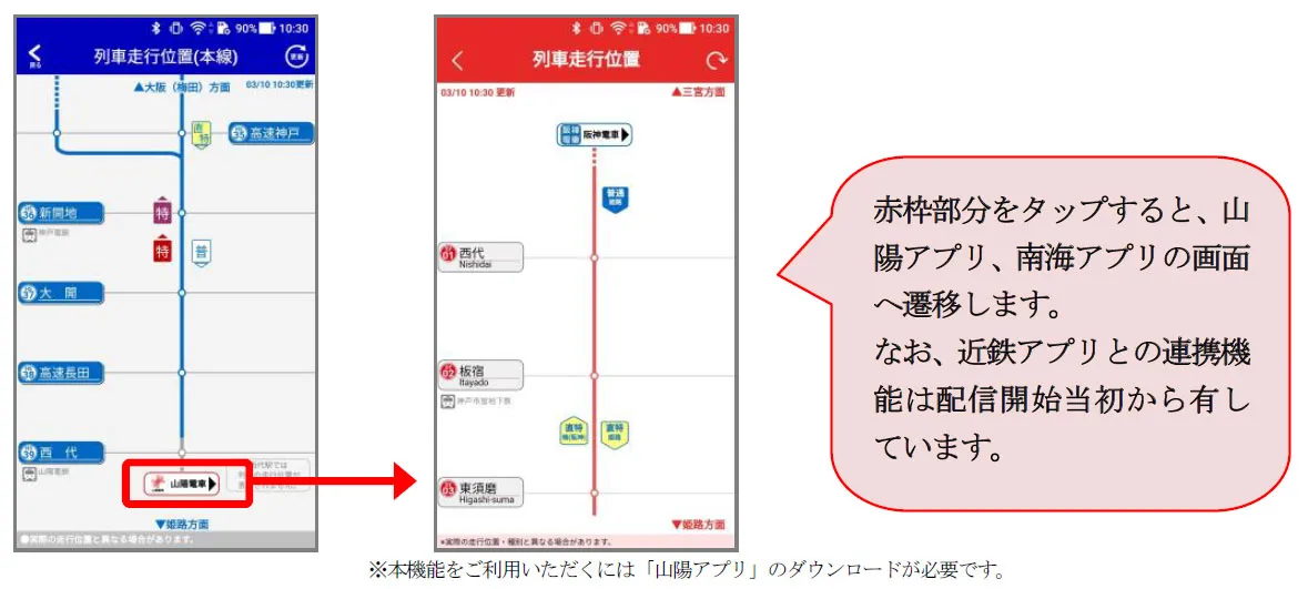 このたび、さらなる利便性の向上を目指して、相互直通運転を行っている山陽電気鉄道の山陽アプリや、大阪難波駅等で乗り換えられる南海電気鉄道の南海アプリとの連携機能等を新たに追加します。なお、近鉄アプリとは既に連携機能を有しており、鉄道運行情報アプリでの4社連携は関西で初となります。