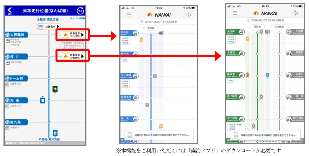 1)列車走行位置画面での山陽アプリ、南海アプリとの連携