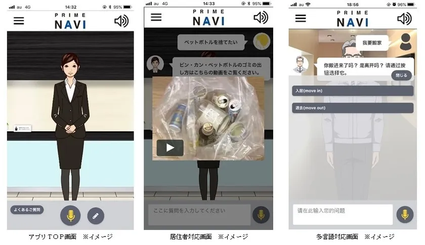 「PRIME NAVI」とは、管理人の勤務時間外や清掃中といった不在時でも、マンション入居者からのさまざまな問い合わせに対して、AIを活用し、スマートフォンやタブレットを介した音声対話対応(日本語・英語・中国語(簡)・韓国語の4か国語)を提供するサービスです。