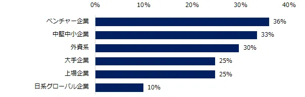積極的に採用活動を行なう会社が「ある」「どちらかといえばある」と回答した方に企業タイプを伺うと、上位に挙げられたのは「ベンチャー企業」(36%)、「中堅中小企業」(33%)「外資系企業」(30%)でした。職種は「技術系(IT・web・通信)」(27%)、「営業系」(26%)、ポジションは「主任・係長クラス」「課長クラス」(いずれも51%)がそれぞれ上位となっています。