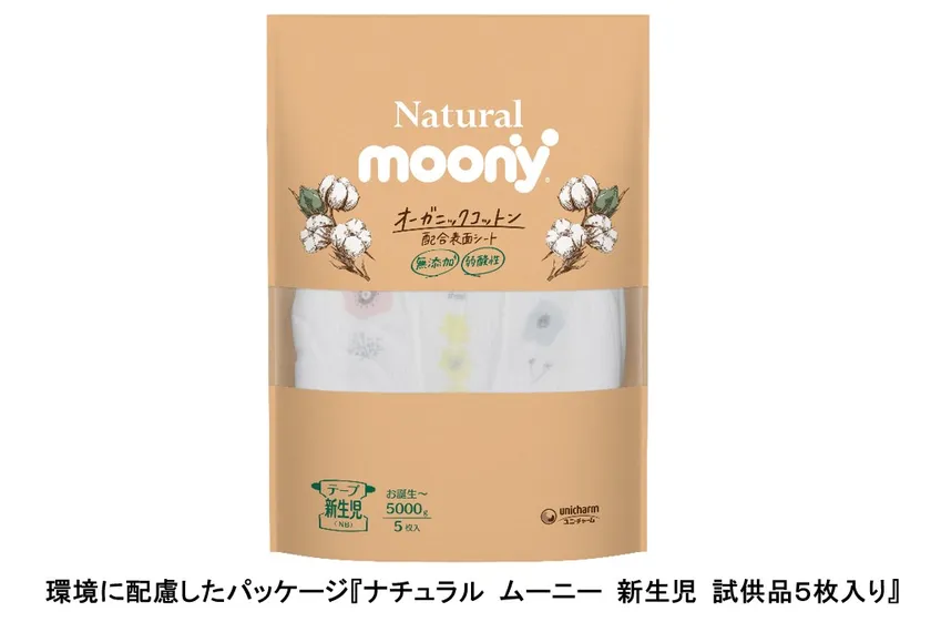 ユニ・チャーム株式会社(本社:東京都港区、代表取締役 社長執行役員:高原豪久)は、最高品質のプレミアム紙おむつである『ナチュラルムーニー』試供品において、地球環境に優しい植物由来のバイオプラスチック使用のパッケージを採用した『ナチュラルムーニー(テープタイプ)新生児 試供品5枚入り』を、2020年4月より順次展開します。