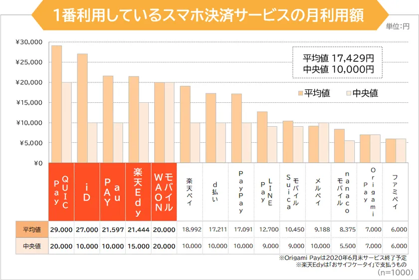 >最も利用金額が多いスマホ決済サービスは「QUICPay」(平均値29,000円、中央値20,000円)