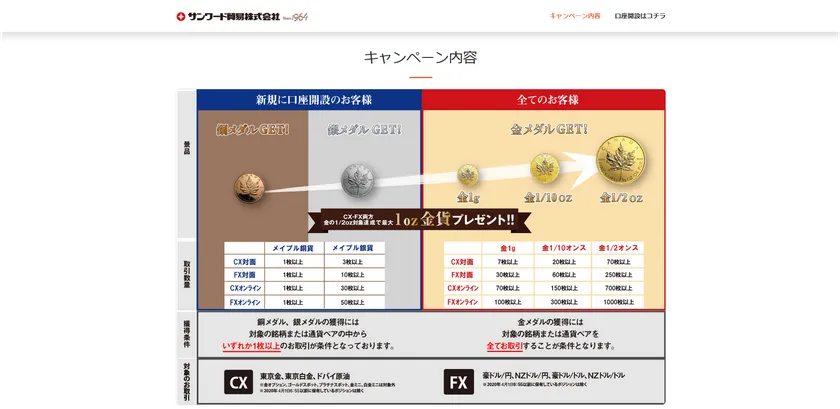 キャンペーン期間中(4月1日6:55~6月30日23:59)に対象銘柄・通貨ペアを新規にお取引された全てのお客様へお取引枚数に応じて、1/2oz金貨(105,652円相当)、1/10oz金貨(22,381円相当)、金1g(8,800円相当)、メイプル1oz銀貨(3,600円相当)、メイプル1oz銅貨(300円相当)のうち1点をプレゼント致します。