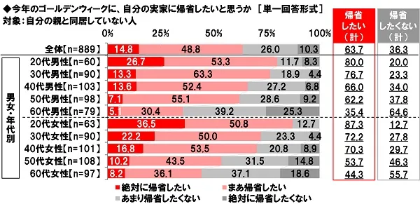 ■「今年のゴールデンウィークに、自分の実家に帰省したい」6割半、20代妻では9割弱