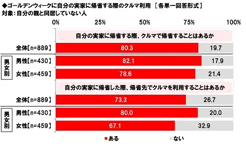 ゴールデンウィークに自分の実家に帰省する際、クルマで帰省することがあるか聞いたところ、「ある」は80.3%、男女別では男性82.1%、女性78.6%となりました。