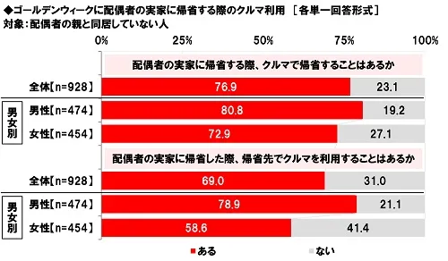 ゴールデンウィークに配偶者の実家に帰省する際、クルマで帰省することがあるか聞いたところ、「ある」は76.9%、男女別では男性80.8%、女性72.9%となりました。