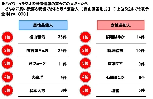 全回答者(1,000名)に、ハイウェイラジオの渋滞情報の声がこの人だったら、どんなに長い渋滞も我慢できると思う芸能人を聞いたところ、男性芸能人では1位「福山雅治さん」、2位「明石家さんまさん」、3位「所ジョージさん」、女性芸能人では1位「綾瀬はるかさん」、2位「新垣結衣さん」、3位「広瀬すずさん」となりました。福山雅治さんのような落ち着きのある声や、綾瀬はるかさんのような優しい声がラジオから聞こえてきたら、長い渋滞が苦にならないという人が多いようです。