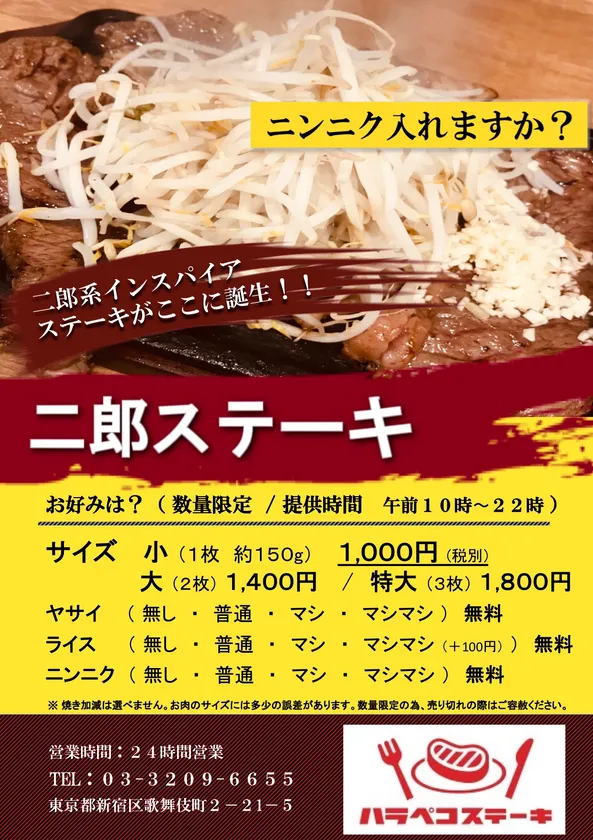 株式会社トライポッド(本社:東京都渋谷区、代表取締役社長:廣川 真一)が運営する、24時間営業の赤身ステーキ&粗挽きハンバーグ専門店『ハラペコステーキ新宿本店』(新宿区歌舞伎町)において、二郎系インスパイヤ×ステーキ「二郎ステーキ」(商標登録出願中)を、2020年3月27日(金)午前10時よりレギュラーメニューとして販売いたします。