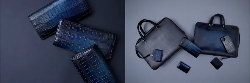皮革の中でも高級素材とされるクロコダイルを「金の気」を持つ灰色、「勝色」はとして勝利への験担ぎに古くから用いられている伝統と誇り高き紺色、この2色を併せ持つ「贏-Ei-」色に、運気上昇や験担ぎとの想いを込め染め上げました。