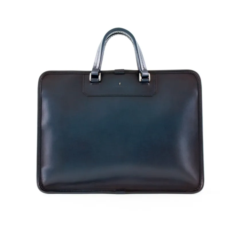 端正な表情に手染めのグラデーションが映えるブリーフケース。8.5cmと薄マチながら背面にファスナーポケット、内装部にマチなしポケット2つと片マチポケット1つ、3つのペンホルダーとさらにボタン留めのポケットを2つ備え、豊富な収納スペースを確保。内装生地は擦れに強く丈夫な高密度ナイロン「ビートテックス」を使用。デザインはもちろん、「使う」ことに重点を置いた緻密な設計。