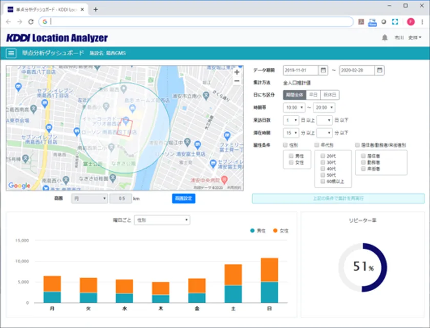 分析施設地図、条件設定、曜日別来訪者数、リピーター率