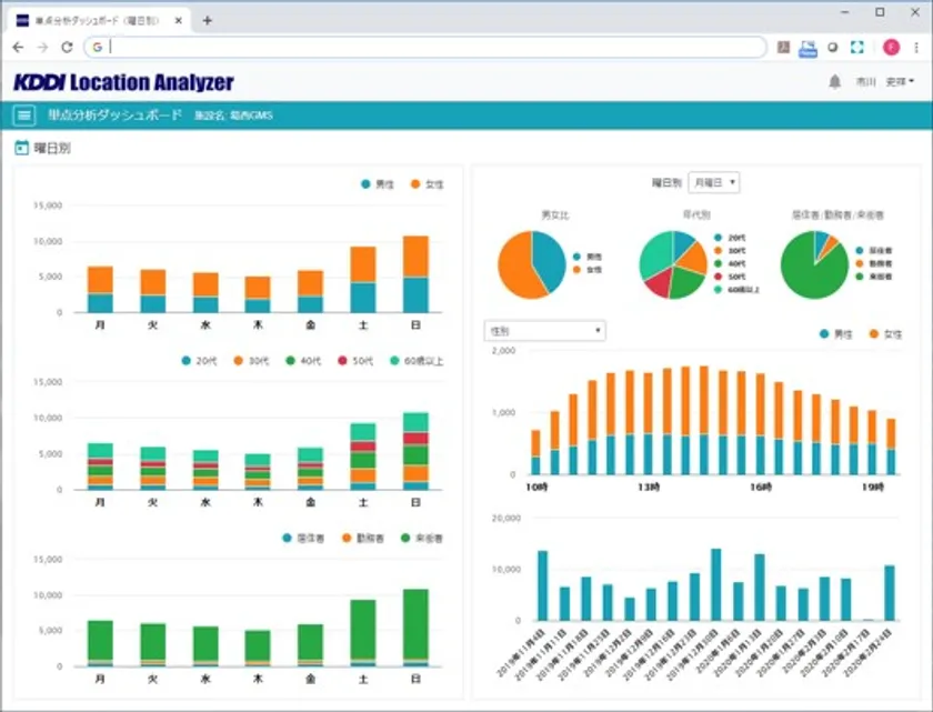 今回追加される新機能「単点分析ダッシュボード」により、下記のような分析データを素早くかつ見やすく作成できるようになります。KDDI Location Analyzerのダッシュボードシリーズの第1弾として標準機能され、従来から活用されている来訪者属性分析と来訪者居住地分析と同様、店舗や施設の来訪者について多角的な分析を可能にします。今後、第2弾として主要動線分析機能、滞在人口分析機能にも対応する予定です。