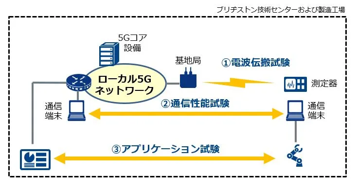 本実験では、4.5GHz帯および28GHz帯の実験試験局免許を取得し、NTT Comがブリヂストン技術センターおよび製造工場内にローカル5Gネットワークを構築することで製造現場のDXにおけるローカル5Gの可用性を検証します。