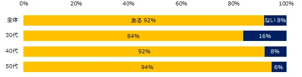 「セカンドキャリアについて考えることはありますか?」と伺ったところ、92%が「ある」と回答しました。「セカンドキャリアについて考えることがある」と回答した方に理由を伺うと、「生涯現役で働き続けたいから」(50%)、「老後の資金に不安があるから」(45%)に回答が集まりました。年代別で15ポイント以上差が出た回答は、 「生涯現役で働き続けたいから」(30代:36%、40代:50%、50代:59%)、「老後の資金に不安があるから」(同:29%、47%、50%)でした。