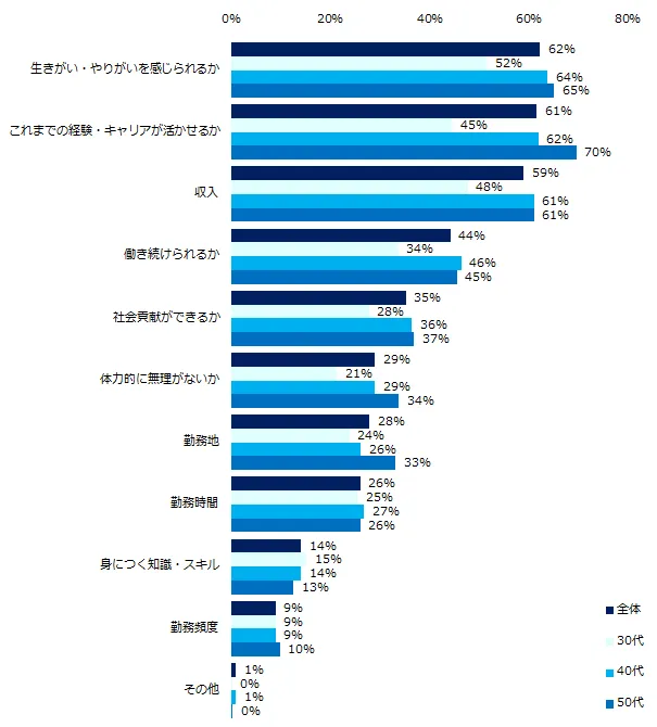 「セカンドキャリアについて考えることがある」と回答した方に、セカンドキャリアを選ぶうえで重視することを伺うと、トップ3は「生きがい・やりがいを感じられるか」(62%)、「これまでの経験・キャリアが活かせるか」(61%)、「収入」(59%)でした。それぞれの理由も紹介します。