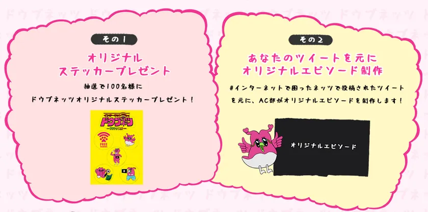 また、ユーザーがハッシュタグ #インターネットで困ったネッツ をつけてツイートするキャンペーンを同時開催。オリジナルステッカーのプレゼントのほか、投稿された内容を元にAC部がオリジナルエピソードを制作します。
