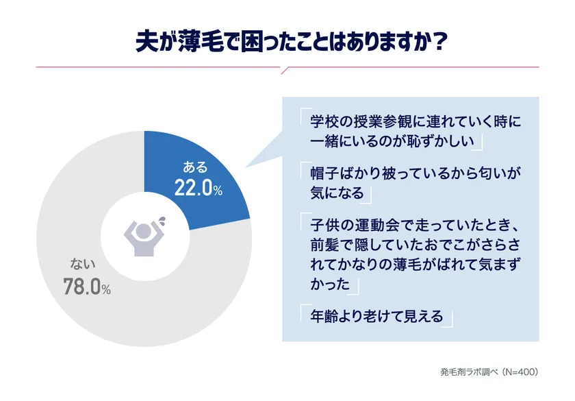 夫が薄毛のせいで自分が嫌になったことや困ったことがあるかという質問には「困ったことがある」人は22%と少数派でした。具体的には「学校の授業参観に連れていく時に一緒にいるのが恥ずかしい」「帽子ばかり被っているから匂いが気になる」「子供の運動会で走っていたとき、 前髪で隠していたおでこがさらされてかなりの薄毛がばれて気まずかった」「年齢より老けて見える」などという声が寄せられました。