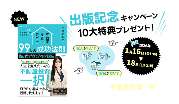 ブルースカイ株式会社(本社:東京・目黒)の代表取締役・奈湖ともこ(本名:奈古友子)は、最新刊『20代でFIREした元ギャル大家が教える不動産投資デビュー99人の成功法則』(2026年1月7日発売)の出版を記念し、2026年1月16日(金)から18日(日)までの3日間限定で、実用ツール配布やリアル懇親会への招待を含む豪華読者キャンペーンを開催いたします。