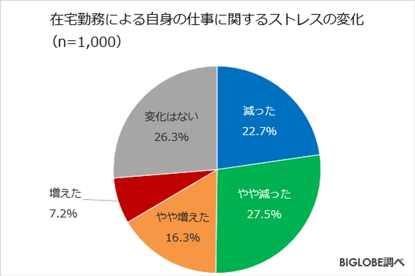 また、「在宅勤務によって自身の仕事に関するストレス(仕事環境、人間関係などを総合したストレス)はどのように変化しましたか」と質問すると、「減った」(22.7%)、「やや減った」(27.5%)、「やや増えた」(16.3%)、「増えた」(7.2%)、「変化はない」(26.3%)と回答。全体の5割超が在宅勤務により仕事環境や人間環境などのストレスが減ったと答えた。