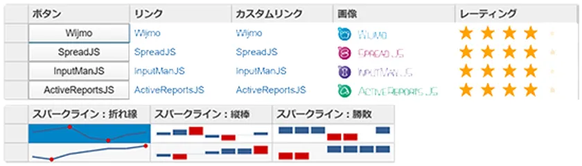 ボタン、ハイパーリンク、画像、スパークライン、レーティングをセルに表示します。HTMLコードを一切記述せずに、プロパティ設定だけで簡単に設定できます。