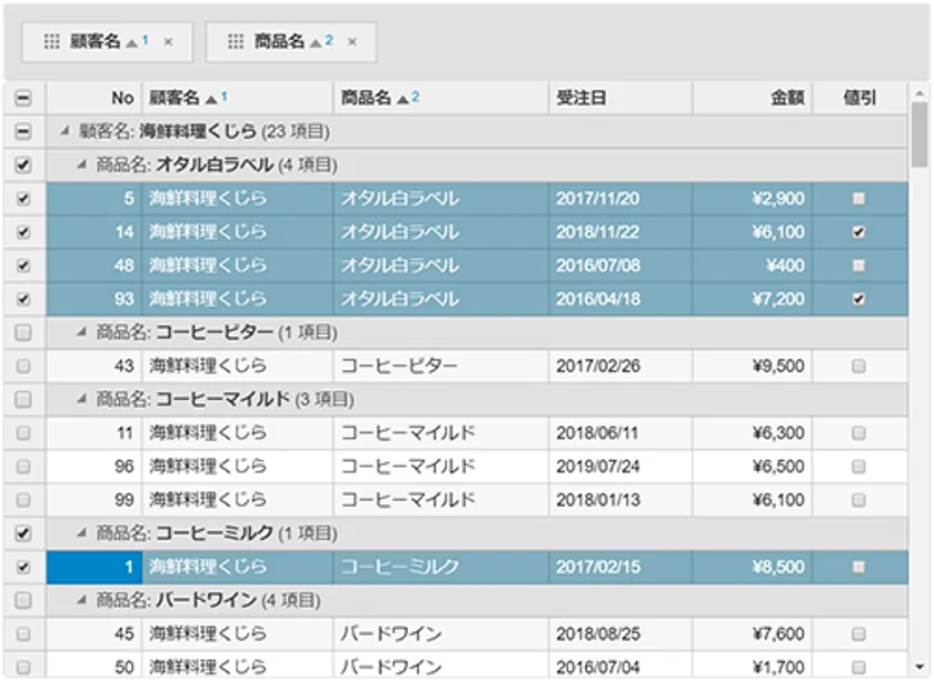 行ヘッダーや任意の列にチェックボックスを表示できます。表示したチェックボックスをクリックして複数の行を選択できることに加え、グループ行にチェックボックスを表示して、グループ単位で選択/選択解除することも可能です。
