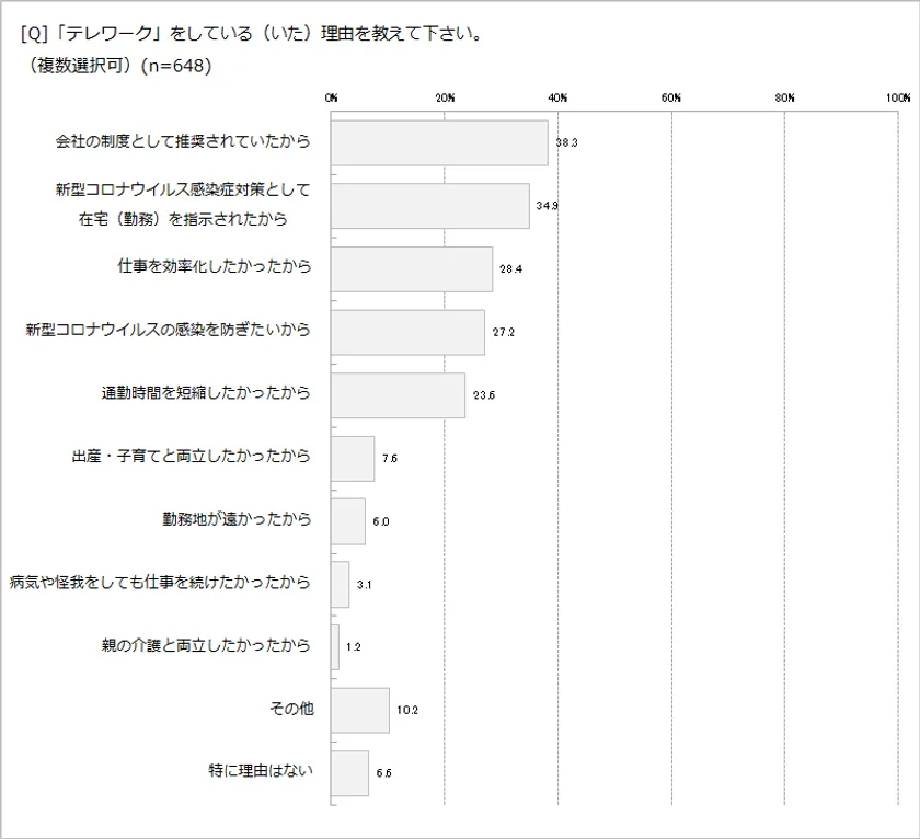 ■テレワークをした理由は、「会社の制度として奨励されていたから」38.3%(248名)、「新型コロナウイルス対策として在宅を指示されたから」34.9%(226名)との回答に集中