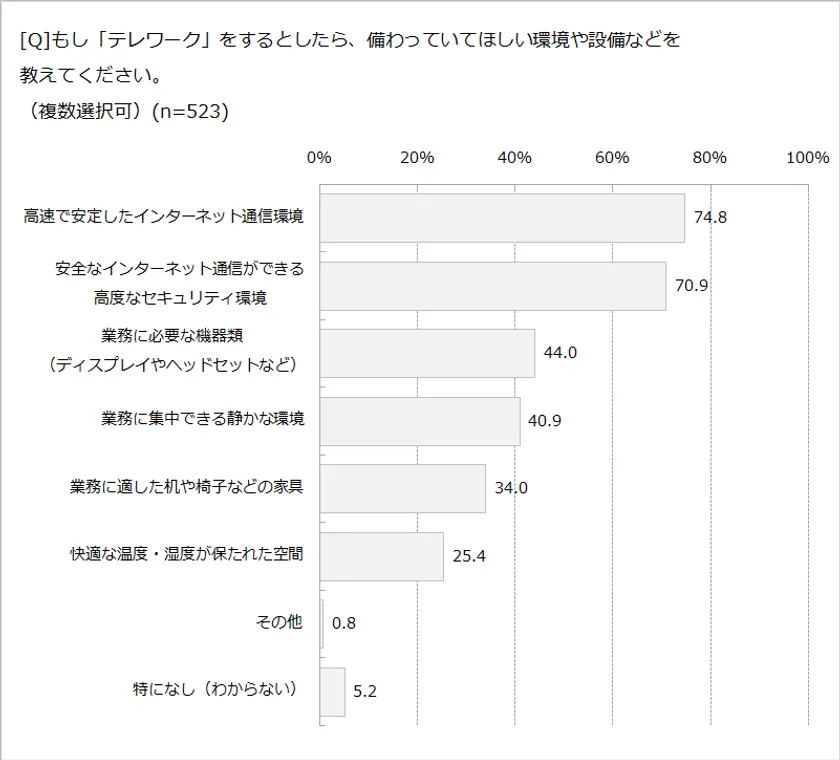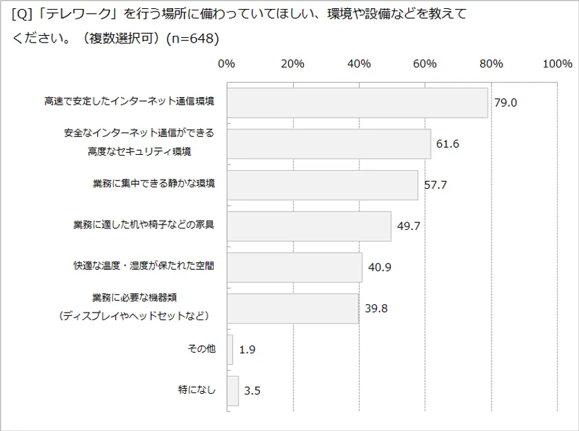 テレワークを行う場所に欲しい環境・設備を尋ねたところ、下記の結果となりました。