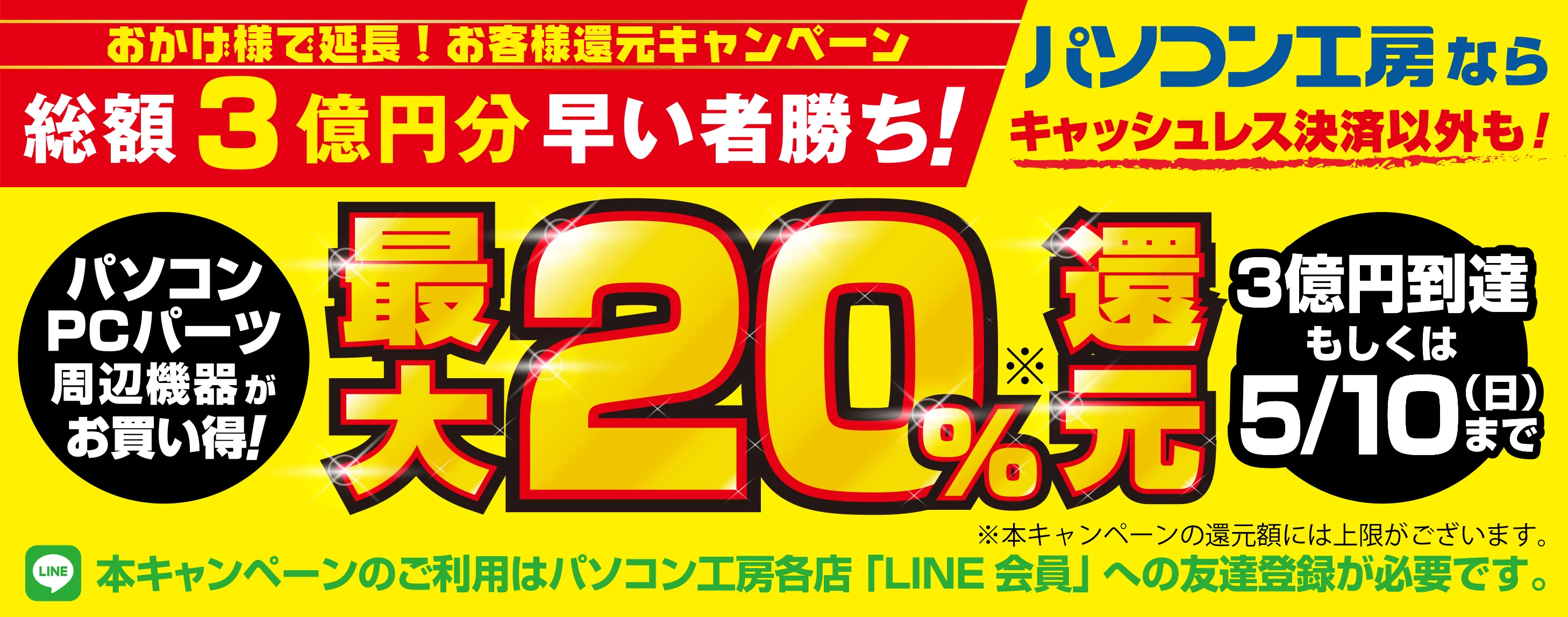 ご好評につき期間延長! パソコン工房「総額3億円分早い者勝ち! 最大20%還元キャンペーン」が5月10日まで延長開催!