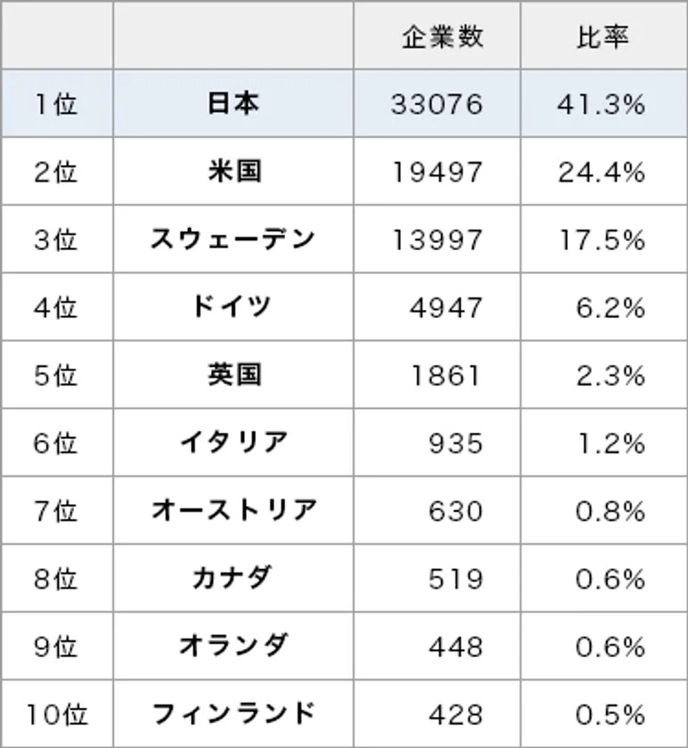 ●日本の創業100年以上の企業は3万3076社で世界第1位。世界の100年企業全体に占める割合は41.3%で、2位の米国の24.4%に約17ポイントの差をつけました