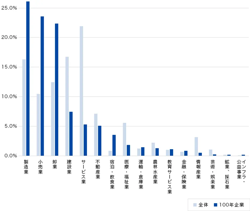 創業100年以上の日本企業を業種別で分析した結果、長寿企業になりやすいのは製造業でした(図3)。製造業(26.0%)の次が小売業(23.5%)、その後に卸業(22.3%)が続きました。