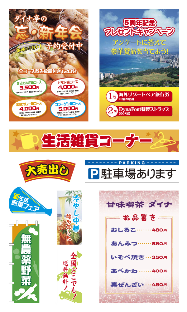 POPやチラシ、パネルをはじめ、プライスカードやメニュー製作などに最適な「チラシ・POP編」と冠婚葬祭向けの礼状、招待状をはじめ、席次表や案内板などに最適な「冠婚葬祭編」、ビジネス向けの文書、名刺、プレゼン資料などには「ビジネス編」を選び、それぞれのシーンに合わせてフォントを使い分けることで、文字による表現効果を狙える、ダイナコムウェア初の提案型製品です。