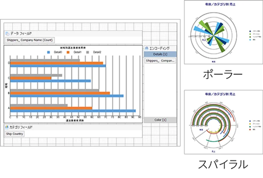 ページ/RDLレポートのChartコントロール(※2)をリニューアルしました。新しいチャート形式として、線軸と半径軸を使用して2次元のデータを描画する「ポーラーチャート」、カテゴリ全体のアイテムの値を開始角度から円周に沿って表現する「スパイラルチャート」を搭載しています。