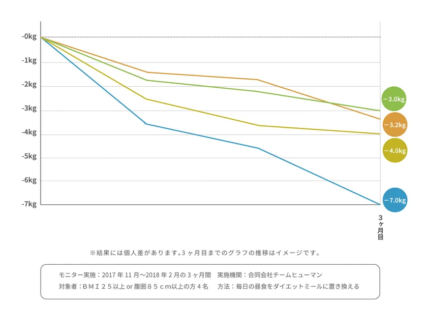 1日3食のうち1食を「ダイエットミール」に置き換えるだけで、食事を楽しみながら緩やかに痩せることができ、かつ“太りにくいカラダ”作りをサポートします。実際にモニター4名の方に3ヶ月間ダイエットミールを利用していただいた結果、最大-7.0kg、平均で-4.3kgのダイエットに成功しました。(※結果には個人差があります。)