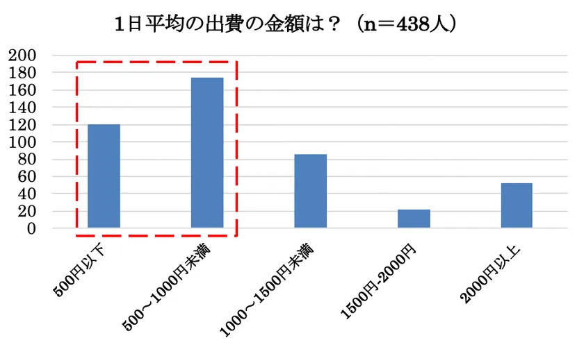 続けて出費が増えたと答えた方に「1日平均の出費の金額は幾らか?」と伺ったところ、1位が500円から1,000円で38.4%(175人)、2位が500円以下で26.3%(120人)、3位が1,000円から1,500円未満が18.9%(86人)という結果となりました。食費の負担が半数以上、1日1,000円未満が6割を超えることから「お昼代」「リモートによるカフェ代」の負担が増えたと想定でき、3月から続く臨時休校による負担が重なることで、特にお子様を持つご家庭にとっては今後も“毎日1,000円未満の負担”が重くのしかかるのではと予想されます。