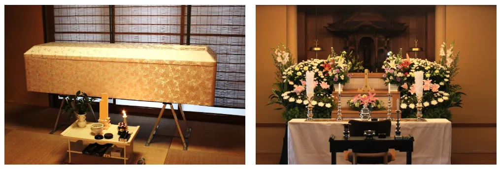 (左写真:納棺イメージ、右写真:後葬・本堂花祭壇プランイメージ)
