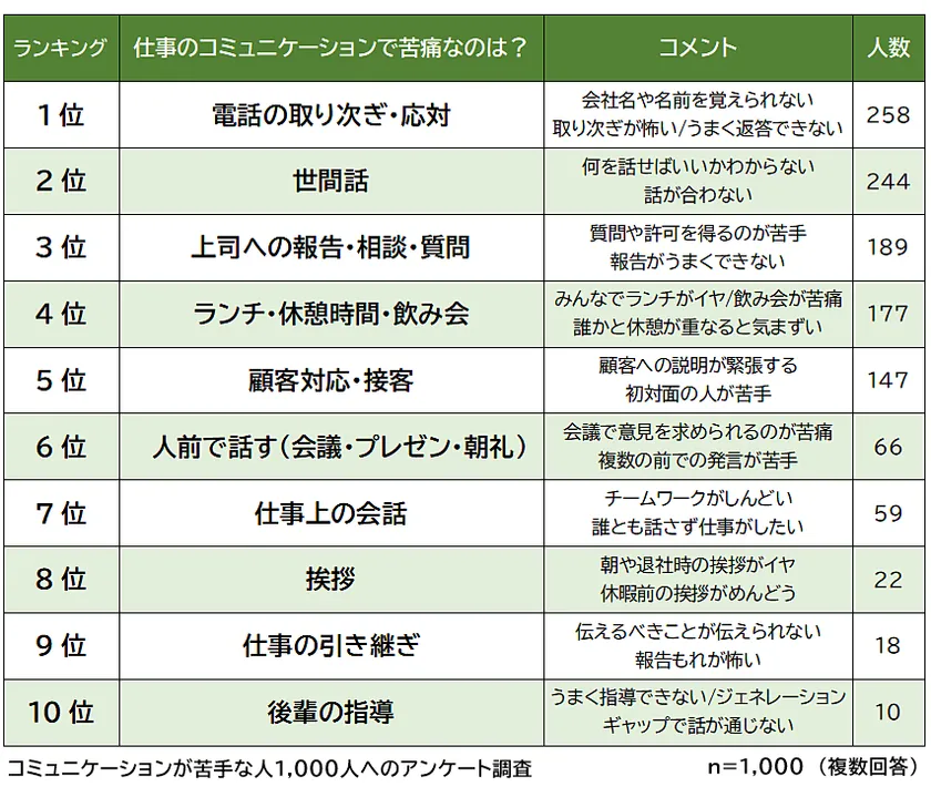 「仕事で苦痛を感じる瞬間」の1位が「電話対応」、2位が「世間話」という結果になりましたが、共通して「応対力への自信のなさ」に関する声がみられました。