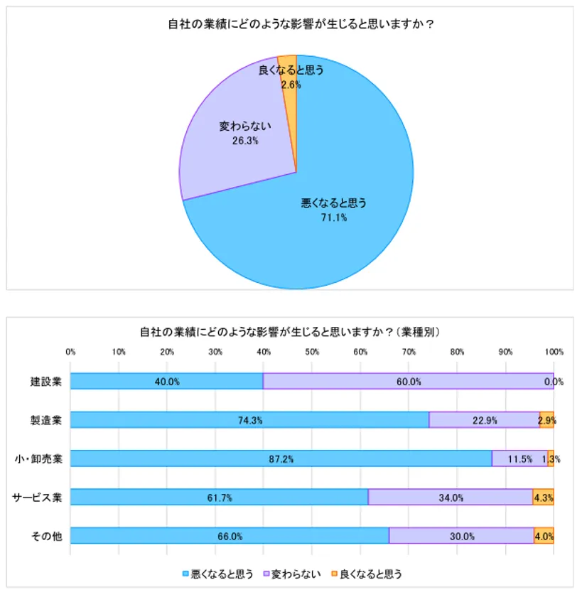 新型コロナウイルスの影響による自社の業績の見通しを聞いたところ、「悪くなると思う」(回答率71.1%)が最多となり、「変わらない」(同26.3%)、「良くなると思う」(同2.6%)の順となりました。
